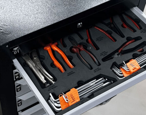 Projetos personalizados em EVA com corte a laser, encaixe perfeito e máxima proteção para transporte, organização e controle de peças.